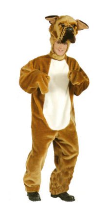 Deluxe Plush Bull Dog Adult Costume for men or women. Includes Headpiece and jumpsuit. One Size. Makes a great mascot.