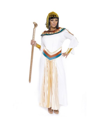 Get ready to exercise your powers of persuasion when you dress as the ruler of ancient Egypt. Our Women's Cleopatra Adult Plus Halloween Costume includes a dress, belt, cuffs, and collar. The dress is an elegant three quarter sleeved white maxi dress. The sleeves go into a slight a symmetrical bell. The collar is brown, gold, and blue thick horizontal stripes with gemstones throughout. The belt features shallow V-shaped belt with matching colors and a panel that falls into small pleats. The included cuffs are a thick solid gold tone, and look great with this costume. You will love our Women's Cleopatra Adult Plus Costume! Add some fun vintage Egyptian/Arabian accessories and you'll look like a million bucks! Try pairing this costume with a fun headpiece and pair of sandals, like those listed in our featured accessories.