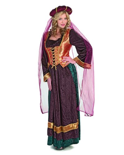 Capture the true essence of medieval times by wearing this indulgent Velvet Medieval Maiden Costume! You are sure to feel like the goddess of another land-- and it will be so much fun! This costume includes a corset topped full length dress and a matching veil! The dress is a rich purple base color with a dark green detail down the sides of your hips. The long sleeves are finished with a beautiful deep gold trim with a matching gold corset that ties up the front! The headpiece is a beautiful matching deep purplish red color with a cold ribbon detail. Coming off of the headpiece is a long matching veil that will make you feel like a deity! But don't stop there! We have a ton of Renaissance inspired jewelry and accessories to make this outfit one of a kind!