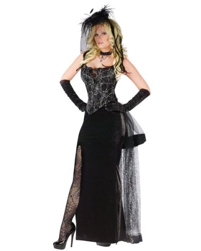 The Women's Spider Kiss Costume features a velvet gown with sheer fabric and lace accents. The bustier top is covered in silver glitter spider web embroidery. The skirt has a spider web lace train and a sheer black bustle back. The costume also comes with e black feather hat with a veil. We love elegant costumes like this because they can be accessorized in so many ways. Wear it as is or make a unique creation with gloves, jewelry, hosiery, shoes and makeup. Add the costume to your cart and explore the Accessories and Hats and Wigs pages for hundreds of ideas. We have everything you could possibly want for your Halloween costume to be perfect.