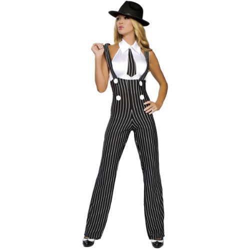 Costume includes stretch hi rise suspender pants and top with built in tie. Hat sold separately.